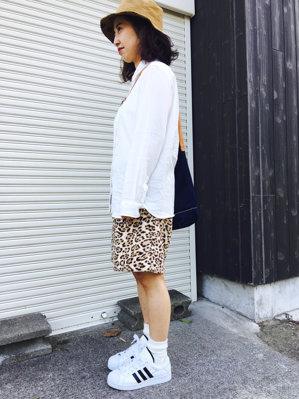 スニーカー、dead stockウルトラスターです。 足になじまない。 ホワイトとベージュでまとめてみました。 ヒョウ柄もこもこハーパン、チャレンジしてみました。保育園のお迎えドキドキしました。。。