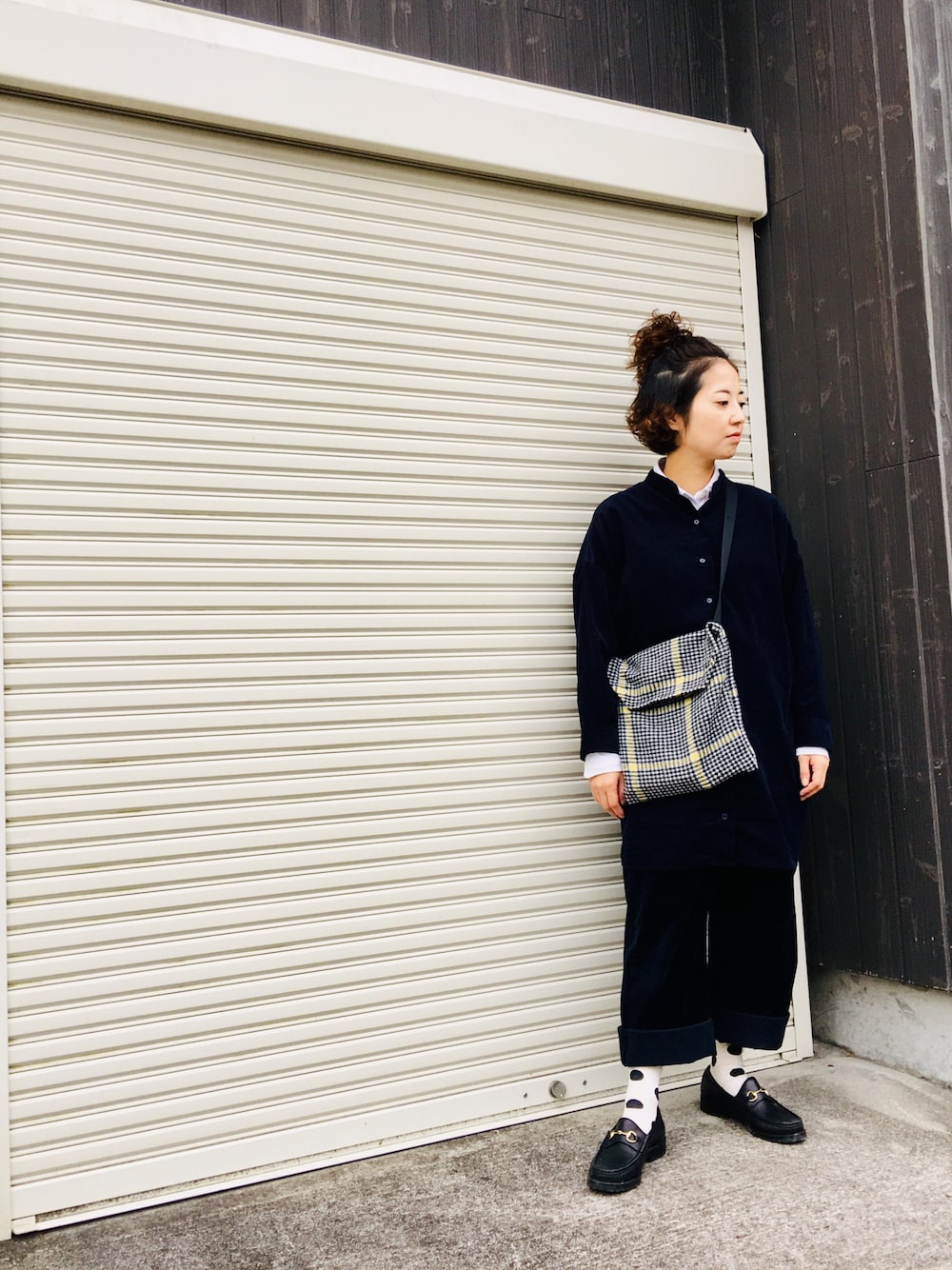 バック、メンズものだけど一目惚れ🙄✨しかもSALEでお安く買えました。 つなぎに見えるけど、シャツワンピとベロア素材のボトムです。こんなくらぁーい色味に、ぽーんっと明るいバックを入れると目を引きますね😋