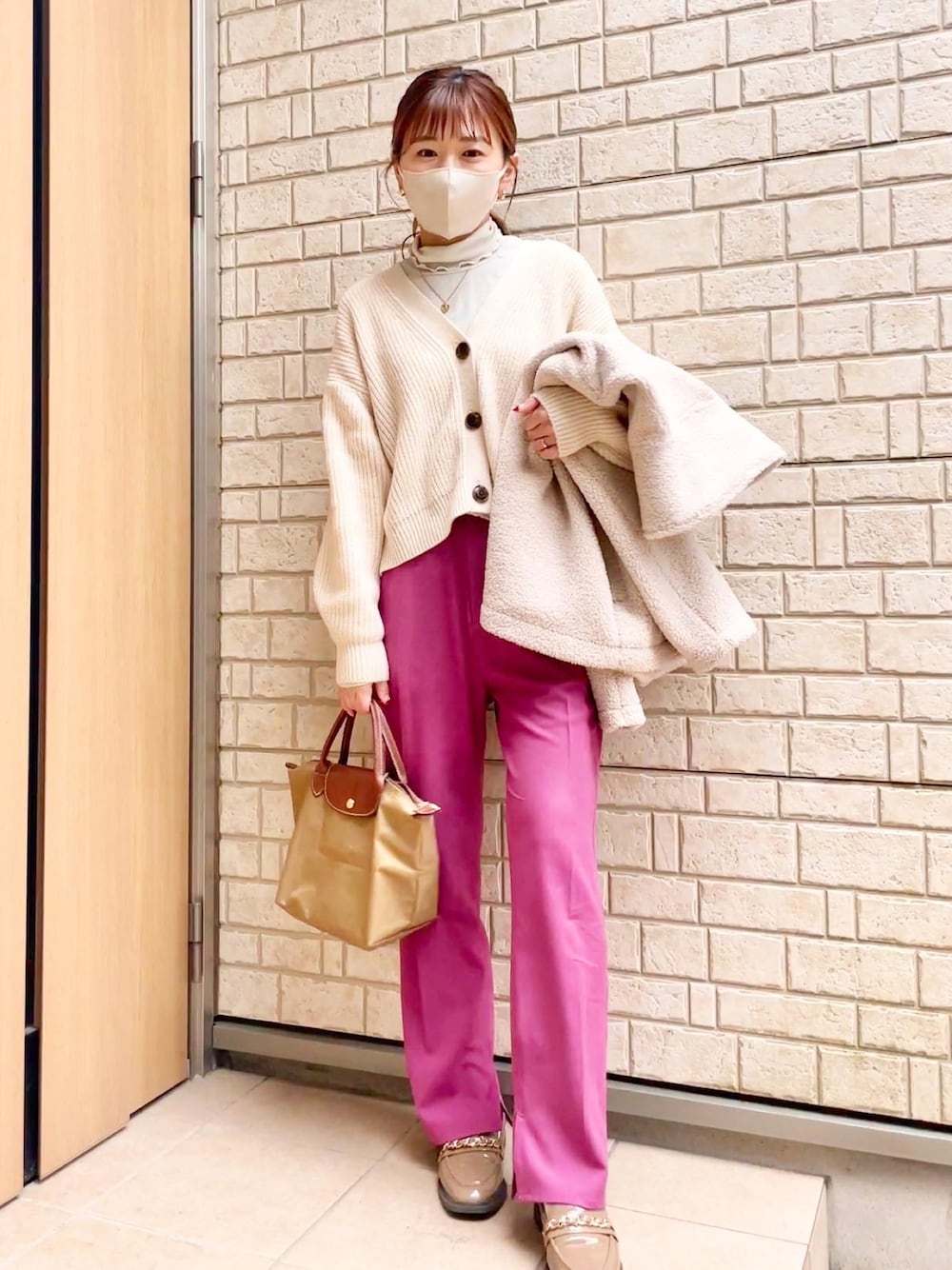 着用コーデ:4件ピンクのパンツコーデ☺︎ 仕事には派手かなと思ったけど、好評だった☺️ 冬の通勤コーデは暗くなりがちだから、最近気に入ってる♡