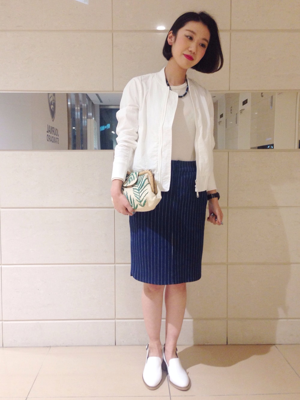 春らしいホワイトのブルゾンはスカートやワイドパンツにも合わせやすくオススメです☆ ボタニカル柄のクラッチも春夏活躍しそうです!