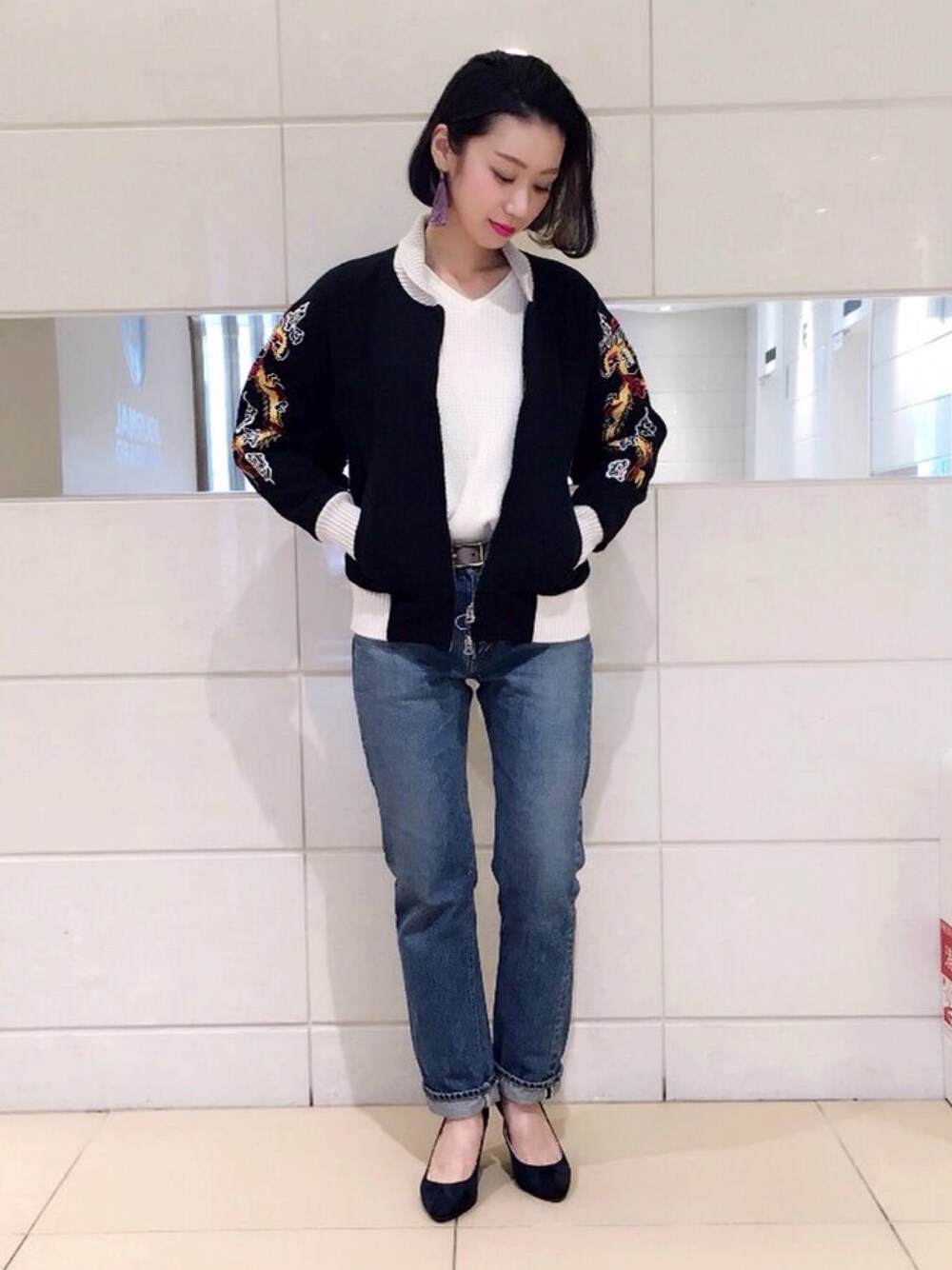 Jacket: Cal O Line (別注スーベニアJKT) ¥35.000 Inner: freak's store (畦Vネックニット) ¥5.800 Btm: orSlow (IVYFIT デニム107use) ¥19.000 Shoes: freak's store (ポインテッドヒールパンプス) ¥12.000→¥8400 スーベニアジャケットをメインにシンプルで女性らしく。