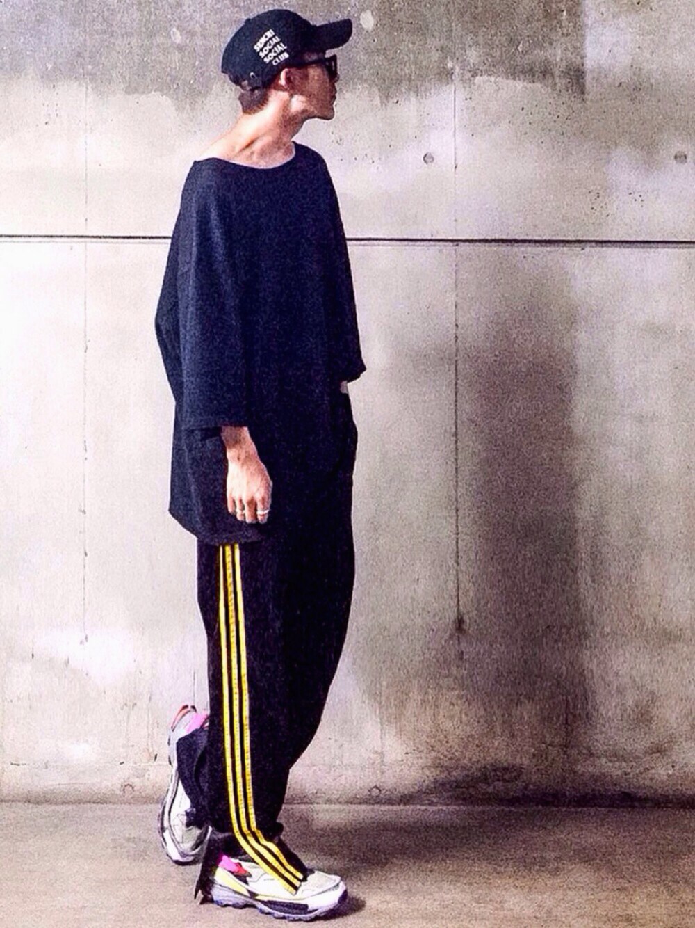 トラックパンツの裾には、セルフでサイドスリットを入れてリメイク。 コーデにビタミンカラー差し込むとグッと今年っぽくなります