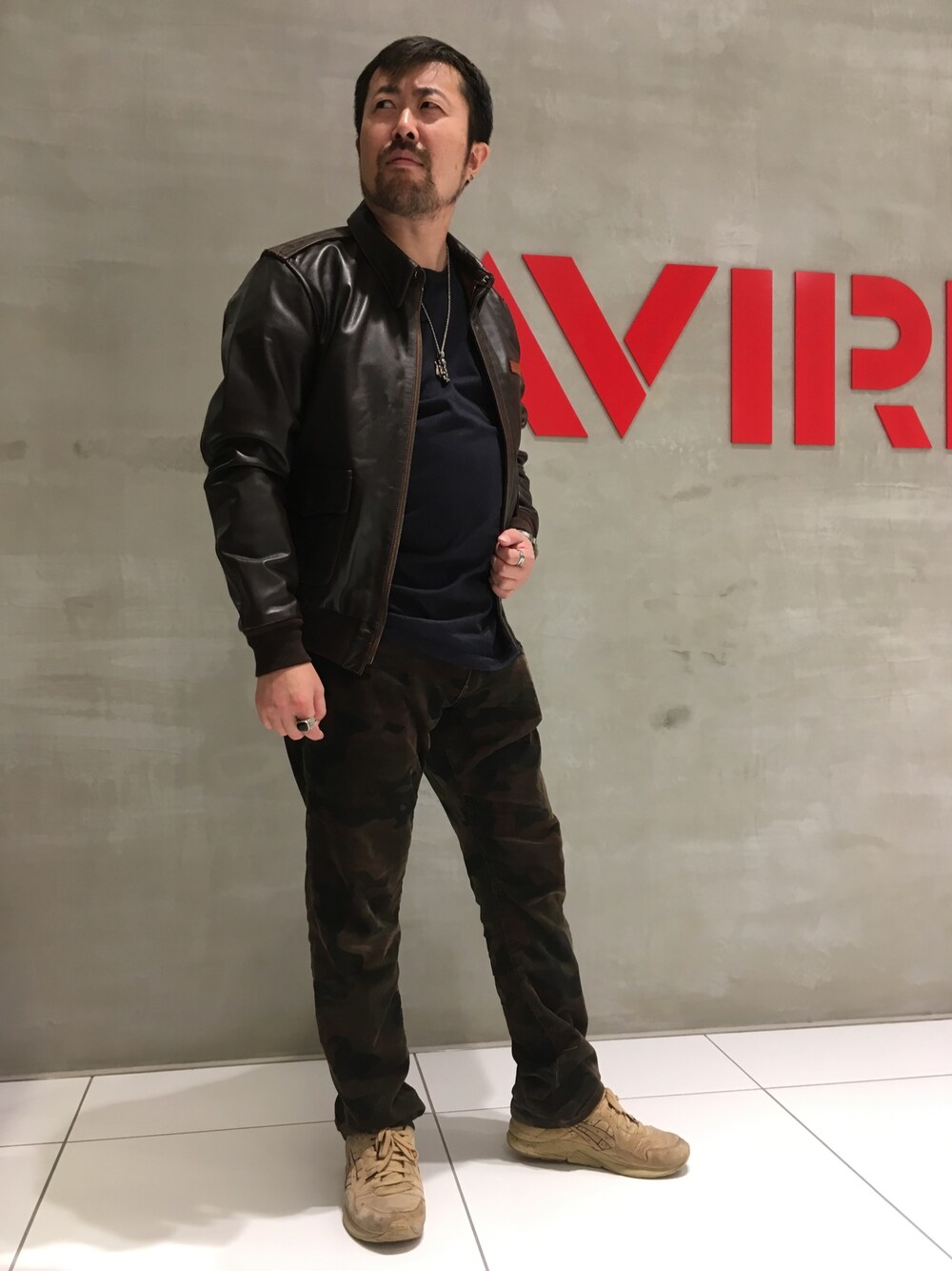TAKASIのミリタリージャケット「avirex/アヴィレックス/メンズ/TYPE A-2 COWHIDE/タイプ A-2 カウハイド」を使ったコーディネート