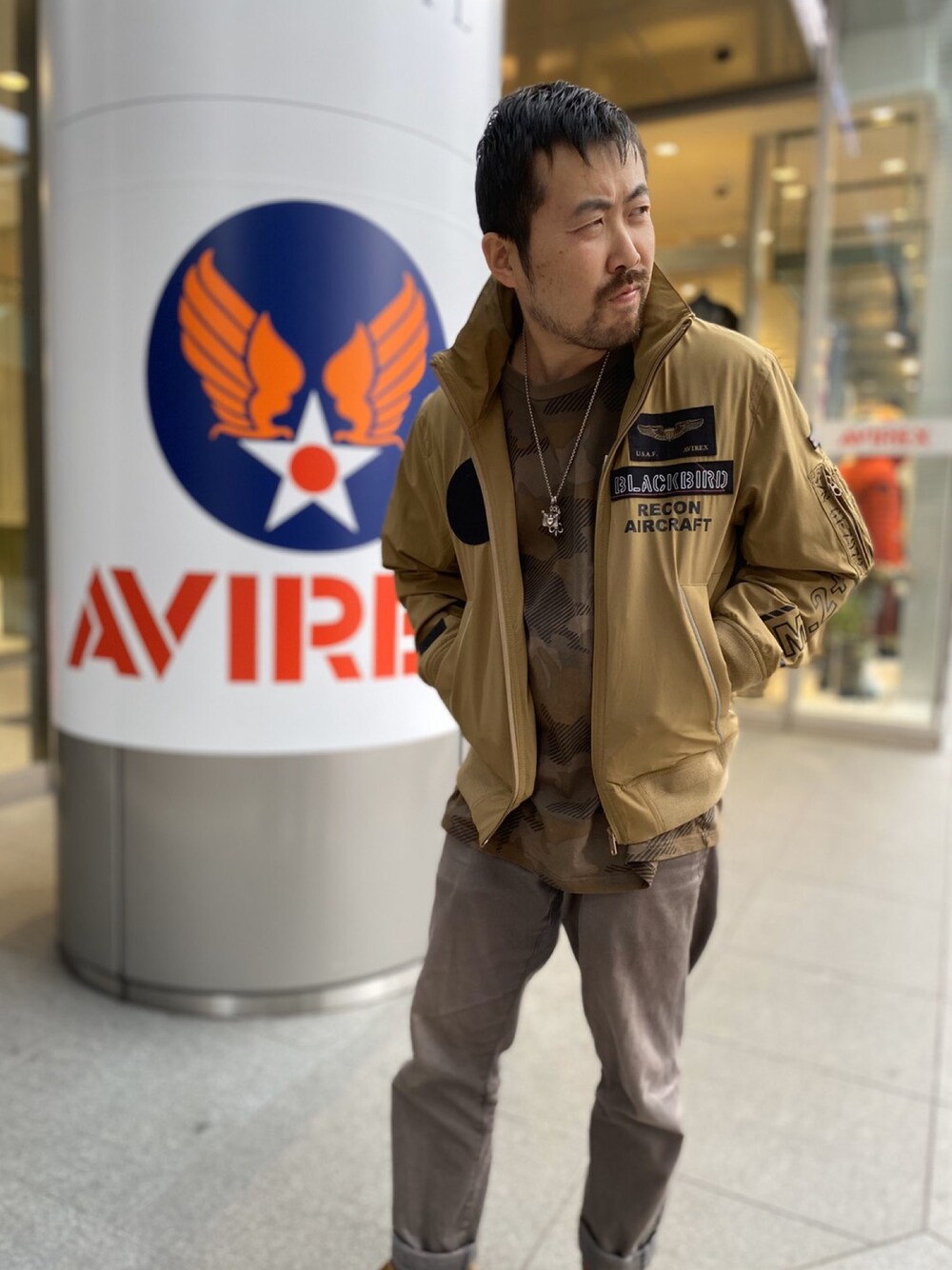 TAKASIのブルゾン「AVIREX アヴィレックス / BLACKBIRD STAND ZIP JKT ブラックバード スタンドジップストレッチミリタリージャケット / 6102133」を使ったコーディネート