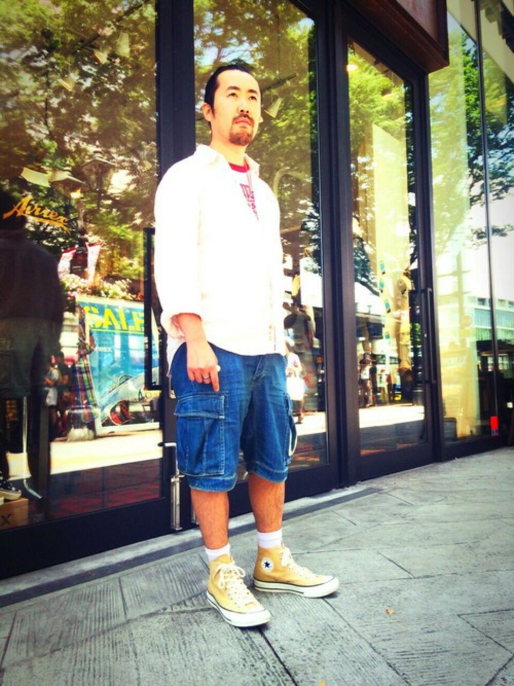 TAKASIのデニムパンツ「avirex/アヴィレックス/メンズ/TYPE BLUE INDIGO CARGO SHORTS/タイプブルー インディゴ カーゴショーツ」を使ったコーディネート