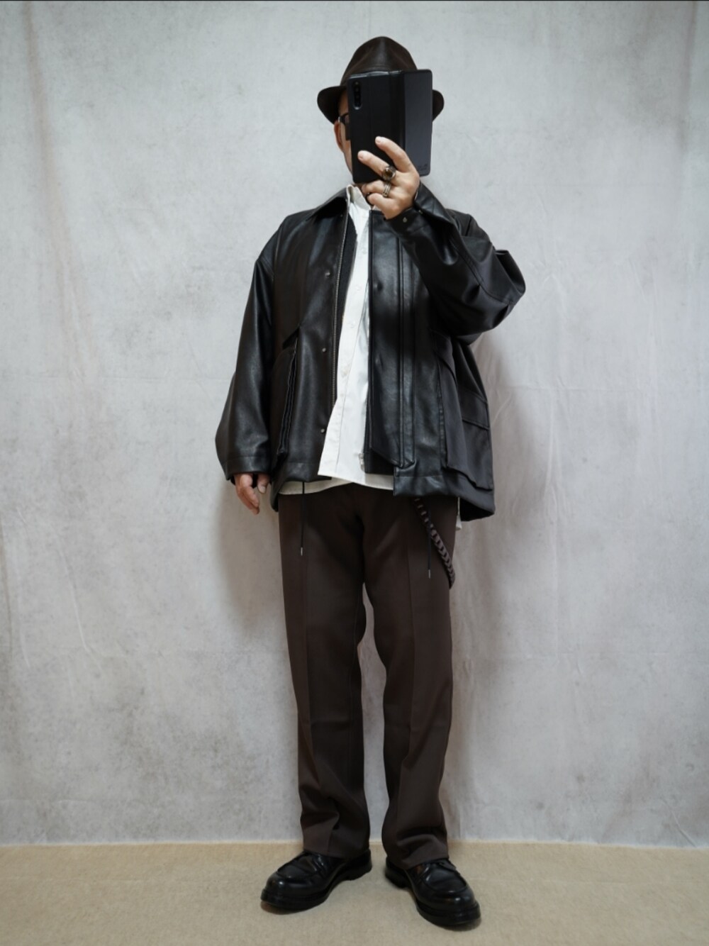 見えにくいですけど、 インナーにジップベストを、 はさんでます。 革ジャンだけでは寒いので… ストールを巻くと、 バランスが取れたかも、 しれないです。