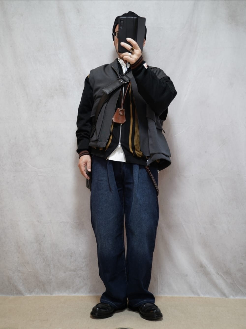 ベストの中にさしこむインナーとしてのジップニットカーデ… その柄と色の配色が、イメージ通りでなかなか良いと思います。