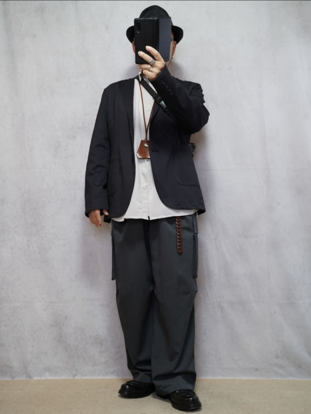 真っ黒コーデではなく、チャコールとか、素材による若干の色味の違いで濃淡をつけてみる。 変則的な、モノトーンコーデ。