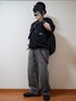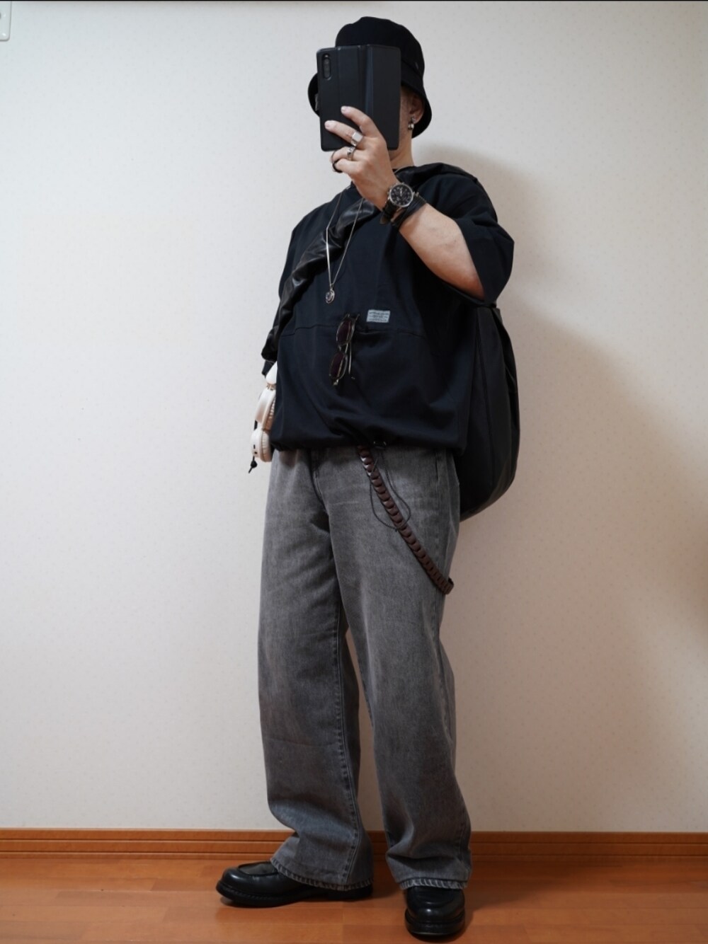 キュッと締めたい時の上半身黒尽くめ… バッグは大きいんですけど、格好良いので… 冷房対策のカーディガンとかストール、 外で吹き出した汗用タオルを入れて、 夏でもアクセントに背負っていたい代物です。