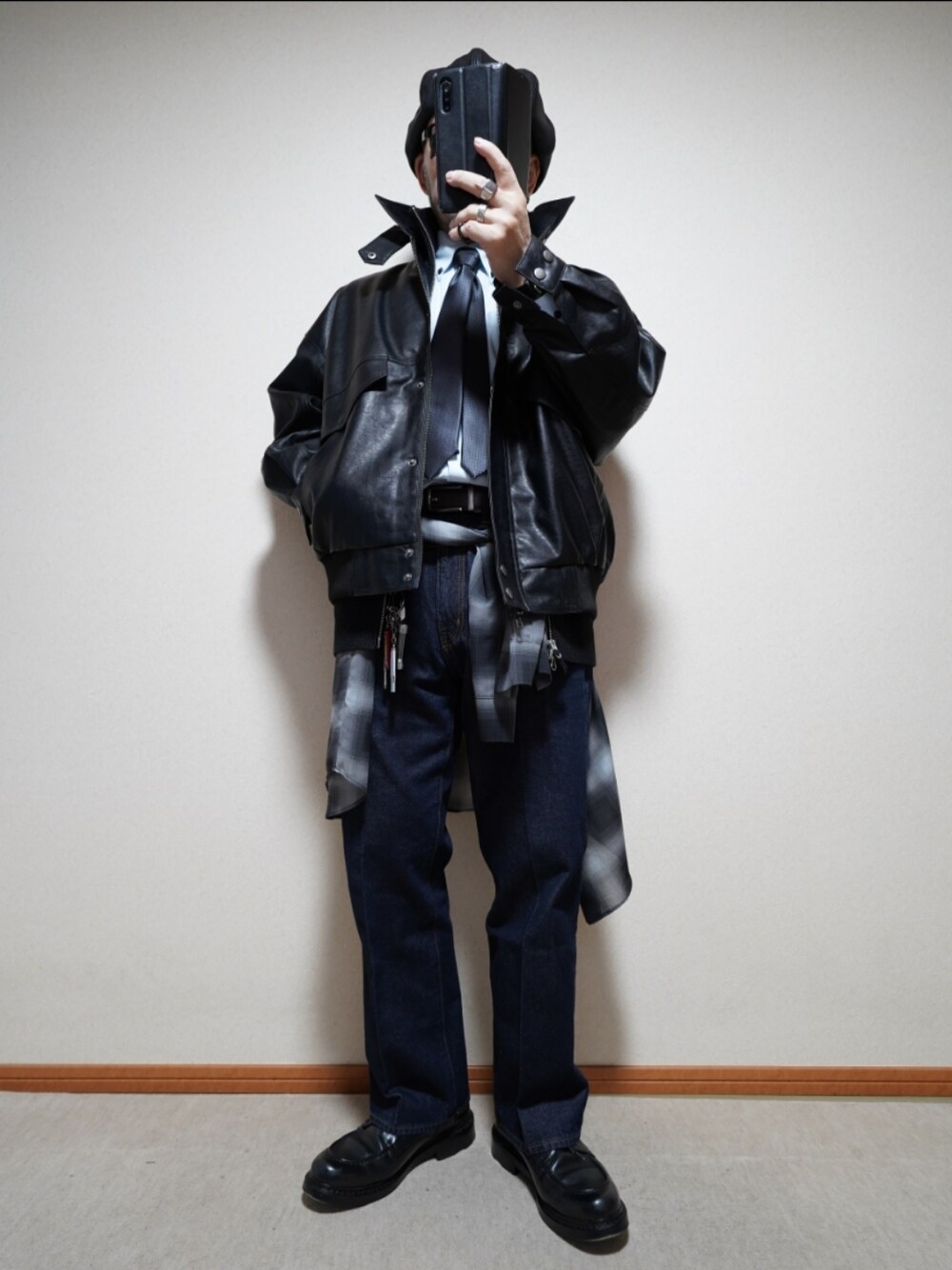 ブルゾンにシャツやらネクタイやら、ジップなニットベストを挟んでたり、腰にシャツ巻いたりなどなど… なんだかゴチャついてます… けど…モノトーンでまとめられている、キレイめなスタイルであると… そんな風に、感じてます。