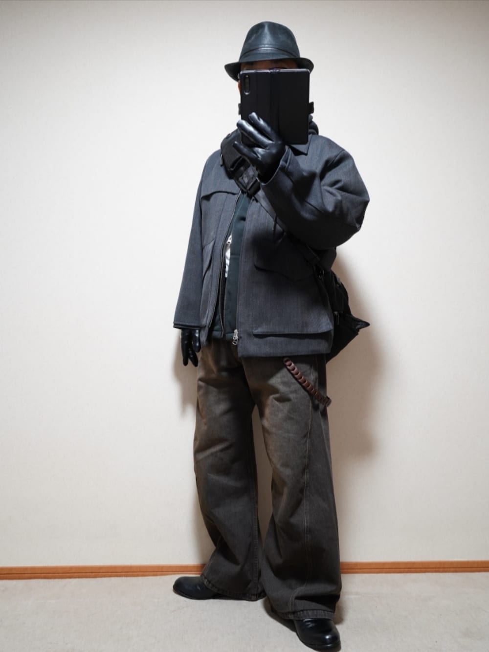 カーブデニムとジップアップパーカーのカジュアルさが強いので、 ハットにキレイめブルゾンと革靴… さらに、ブラックのレザー調のグローブをつけました。 個人的には、上位に入るコーディネートになります。