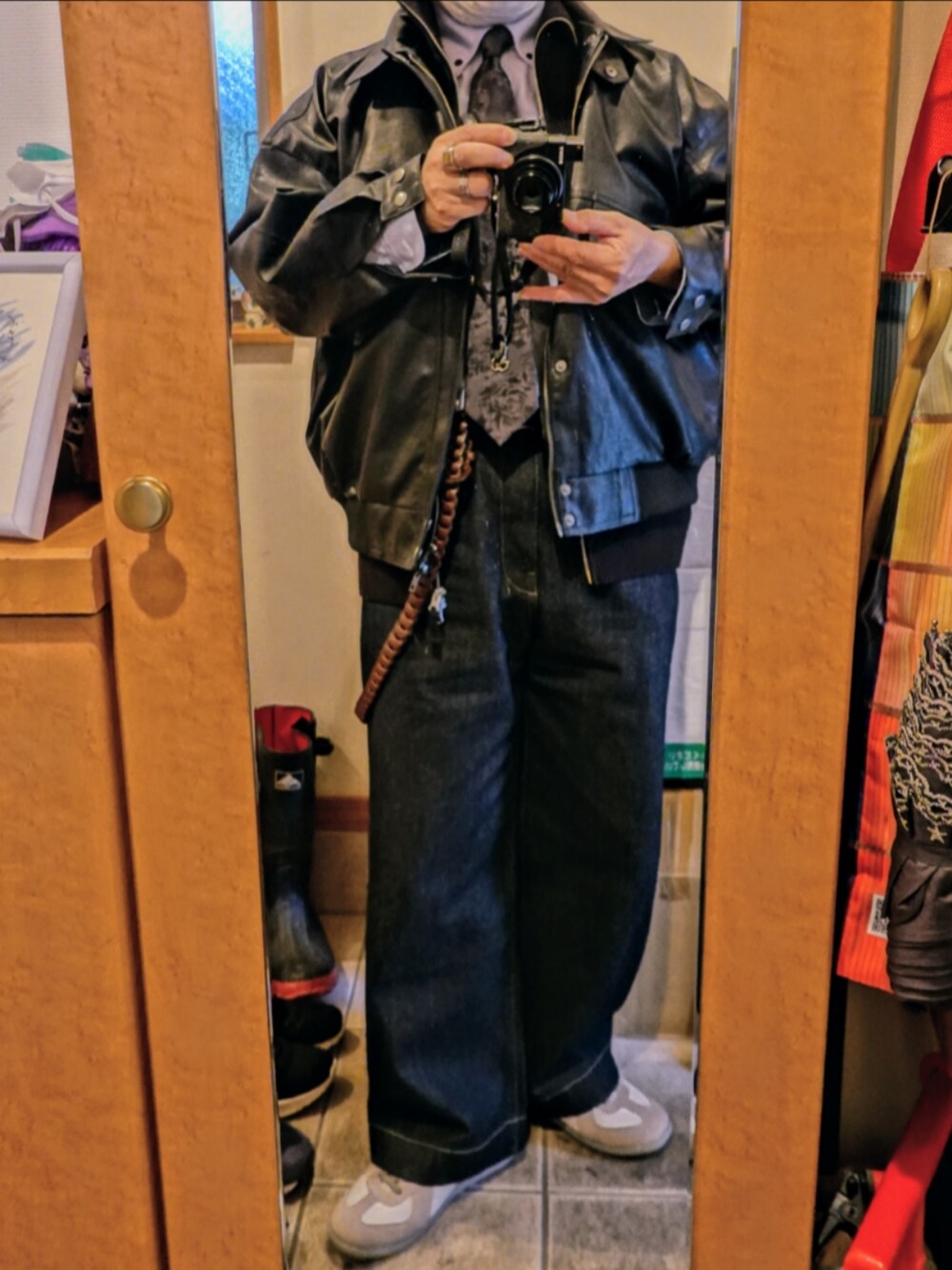 CLELの合皮ブルゾンに、 WYMLIDNMのジップベストと、 バギーデニムを合せつつ、 カジュアルさが増すと分かりつつも、 ジャーマントレーナーを着用する… ウォーキング主体のコーディネート。