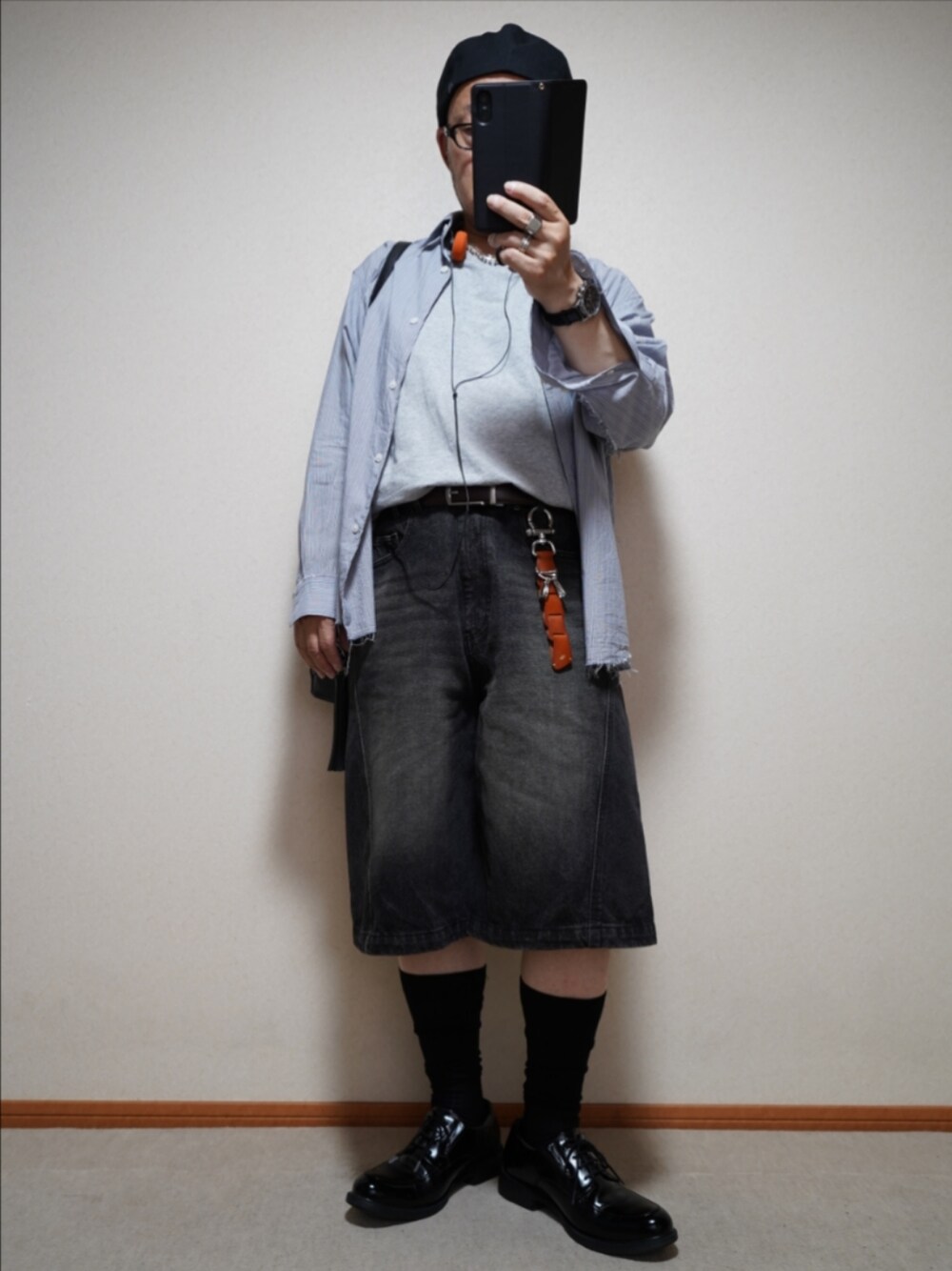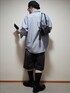 カジュアルなハーフでデニムなパンツ… その子どもっぽさを、いかに払拭させるのか… 色調はモノトーン…で 襟付きの長袖シャツ…に 黒革の靴… を合わせることのコーディネート、なんだと思います。