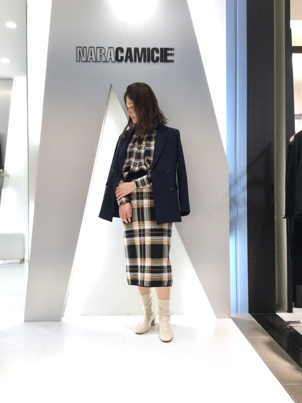 ジャケット:30-12-21-710 1サイズ/ネイビー ブラウス:10-12-01-013 1サイズ/ネイビー スカート:30-12-08-911 1サイズ/ネイビー チェックのセットアップは、素材違いでオシャレ度アップ♪ ニットスカートはとても履き心地が良いです☺︎