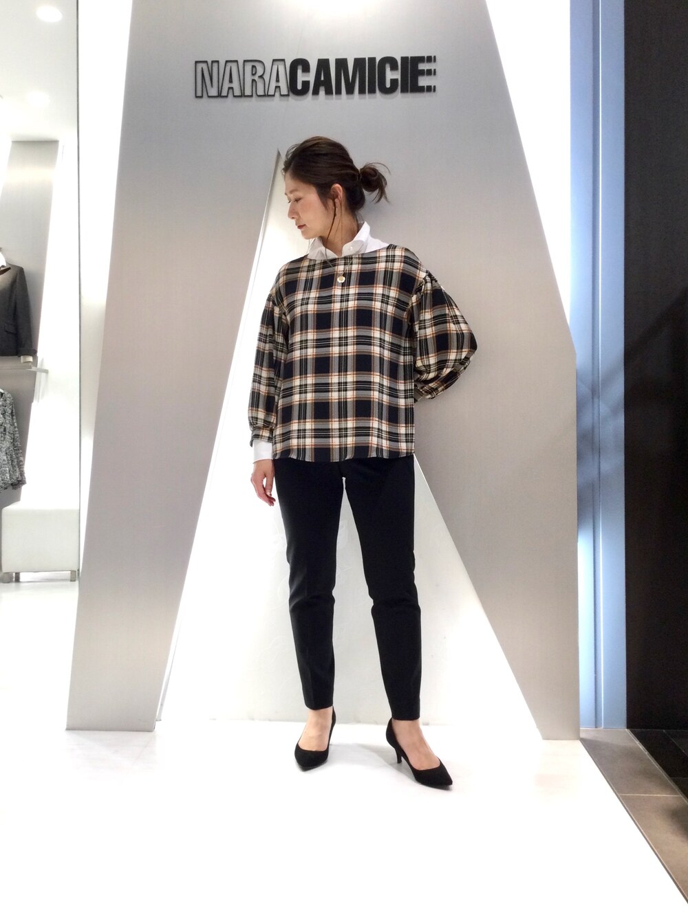 ブラウス:10-12-01-014 1サイズ/ベージュ パンツ:30-12-09-996 1サイズ/ブラック チェックのブラウスは単品でも可愛いですが、白シャツインもオススメです♪