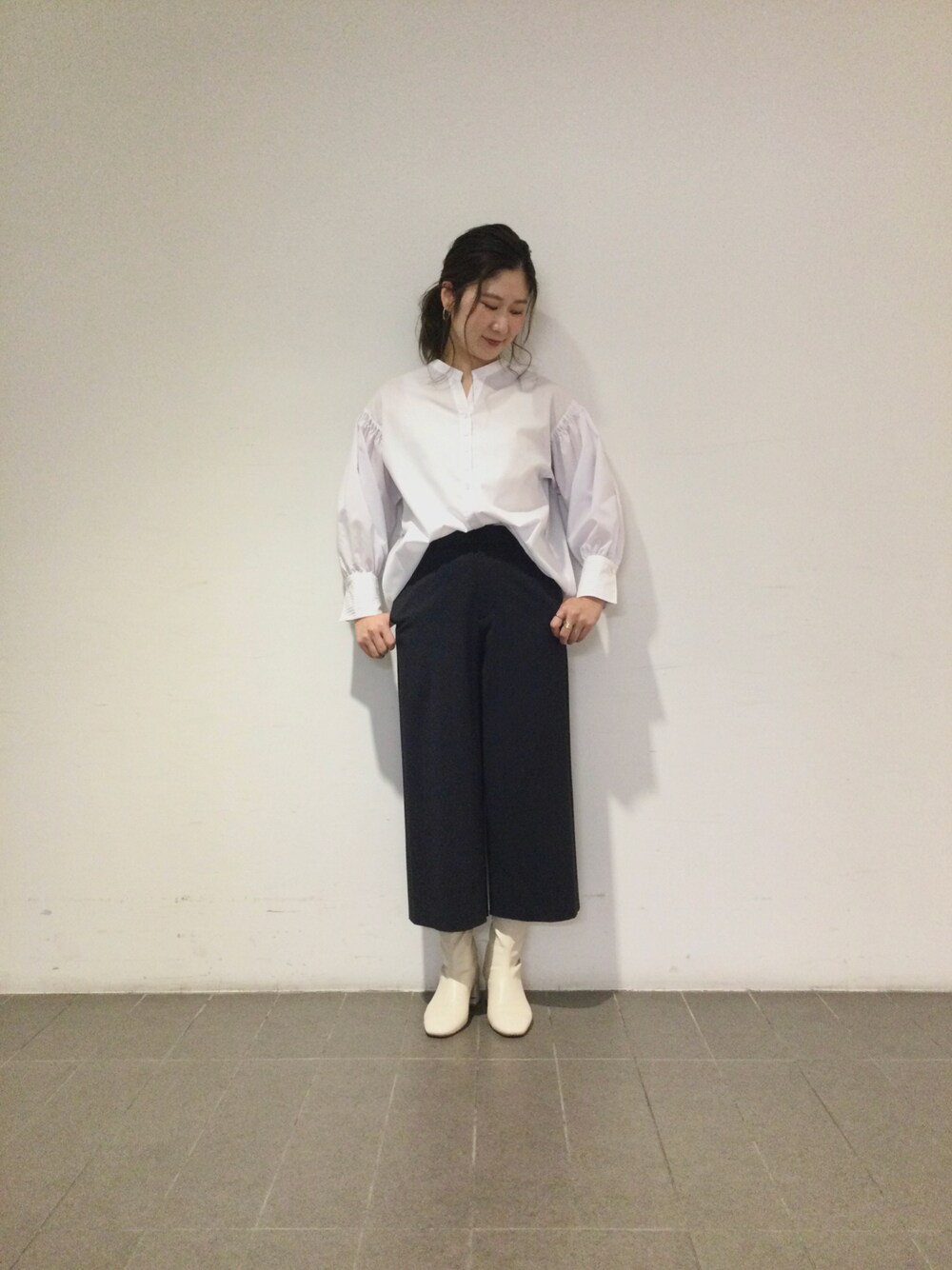 骨格タイプ:ナチュラル シャツ:10-21-01-025 1サイズ/ホワイト パンツ:30-21-09-705 1サイズ/ネイビー ギャザーがたっぷり入った袖が可愛い1枚☺︎ノーアイロンでOK。