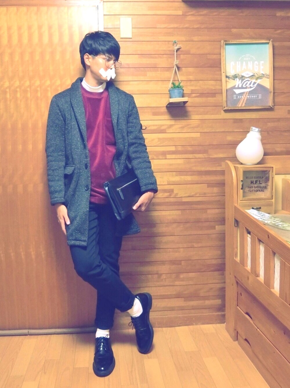 シンプルで光沢感のあるワインレッド。 沖縄でも許されそうな冬コーデ。 意外と沖縄も以外と寒いんです。