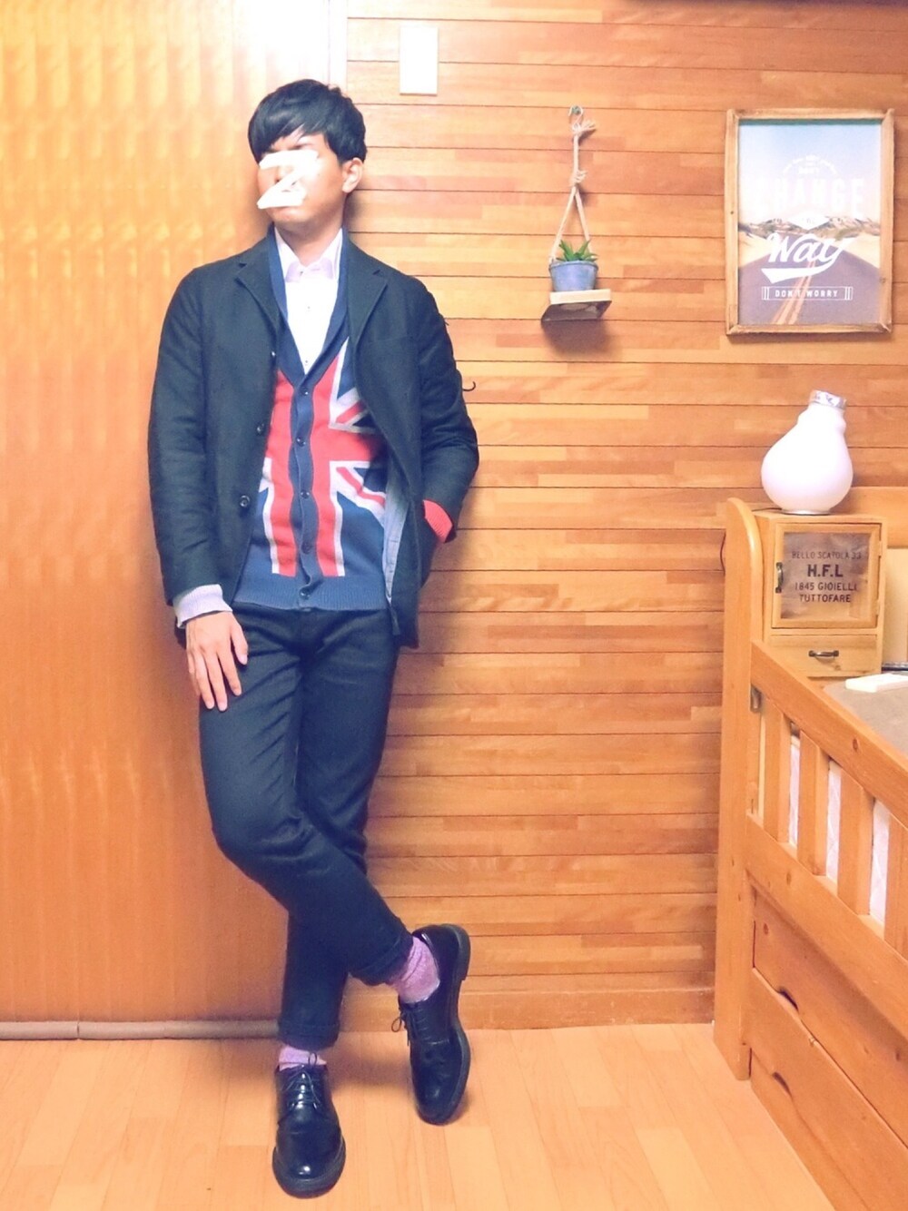 お気に入りのユニオンジャックのカーディガン。 袖の色が左右で違う所も好きです。