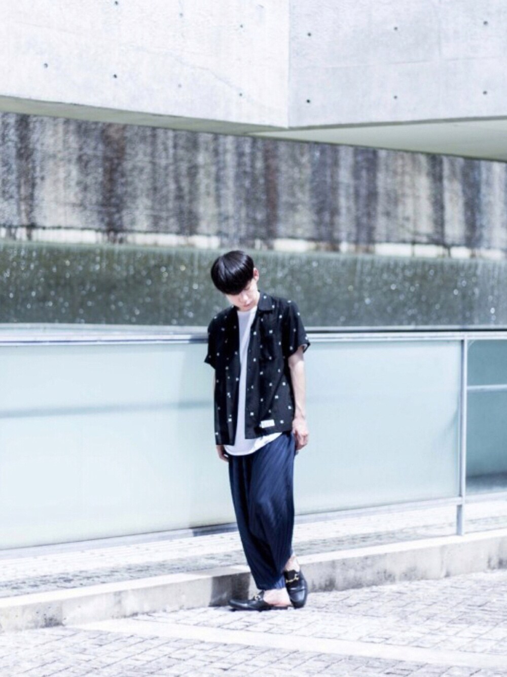 スタイルMIXなコーディネート🚶♂️ 天国東京の文字が散りばめられたWACKOMARIAのメンズ感の強いアイテムにレディースの若干サルエルなプリーツパンツをMIX🪢 正反対の要素を持つアイテムをMIXする事で意外と纏りのあるコーデに仕上がります。