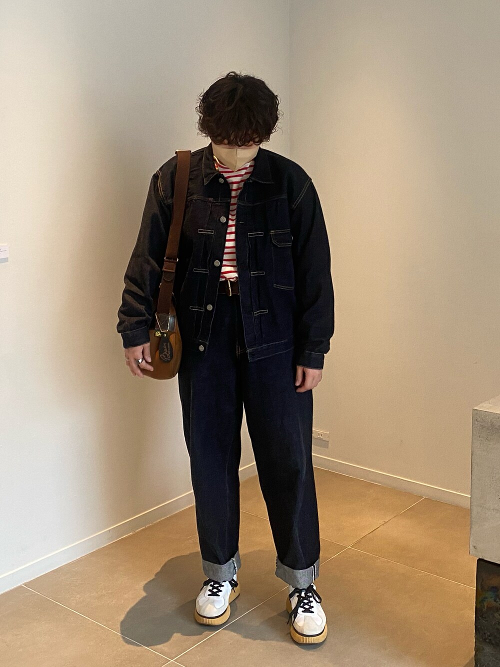 LENOのルーズデーパードとデニムジャケット。 赤ボーダーとも最高に合う🥹❣️
