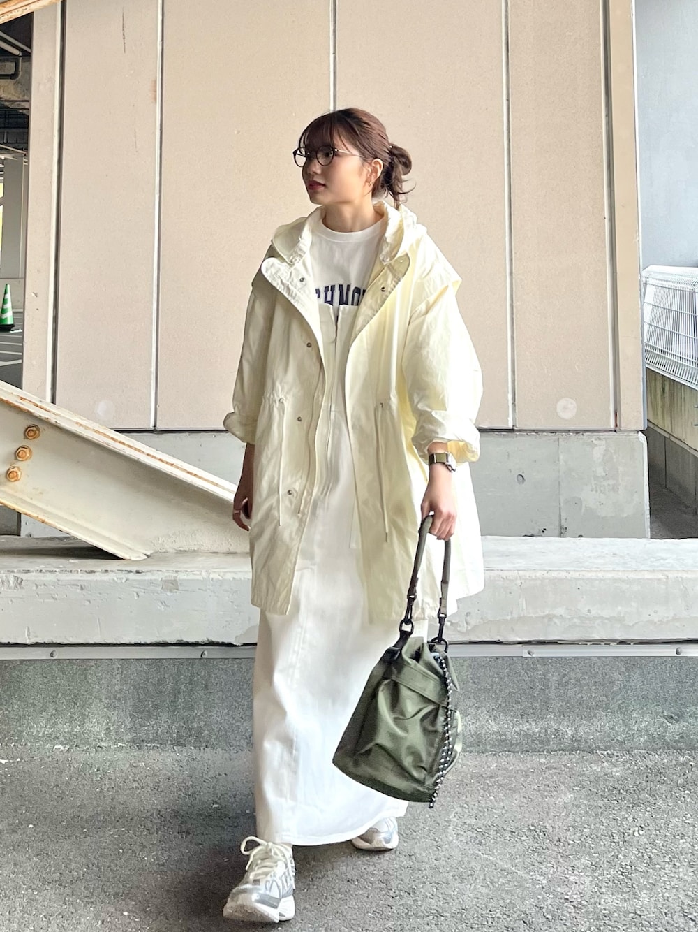 春らしいホワイトコーデ🤍 小物はカーキでまとめて◎ 3way仕様のモッズコートは フード & 袖が取り外し可能なので 一枚で着こなしの幅が広がる万能アイテムです! デニムジャンパースカートは フロントのジップで大人っぽく決まるので嬉しい♪ オフホワイトは、若干透け感あると感じたので インナーで調節することをオススメします!
