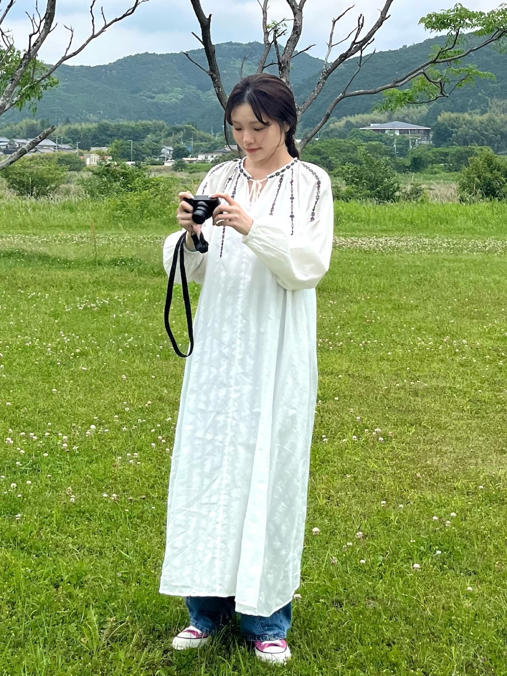 MARKETのワンピースコーデ エスニックな雰囲気がとっても可愛い🌵 袖が長く暑そうに見えるかもしれませんが 生地は薄手でサラッとしているので これからの季節にぴったりです◎ カジュアルにデニムとの レイヤードがオススメです👖