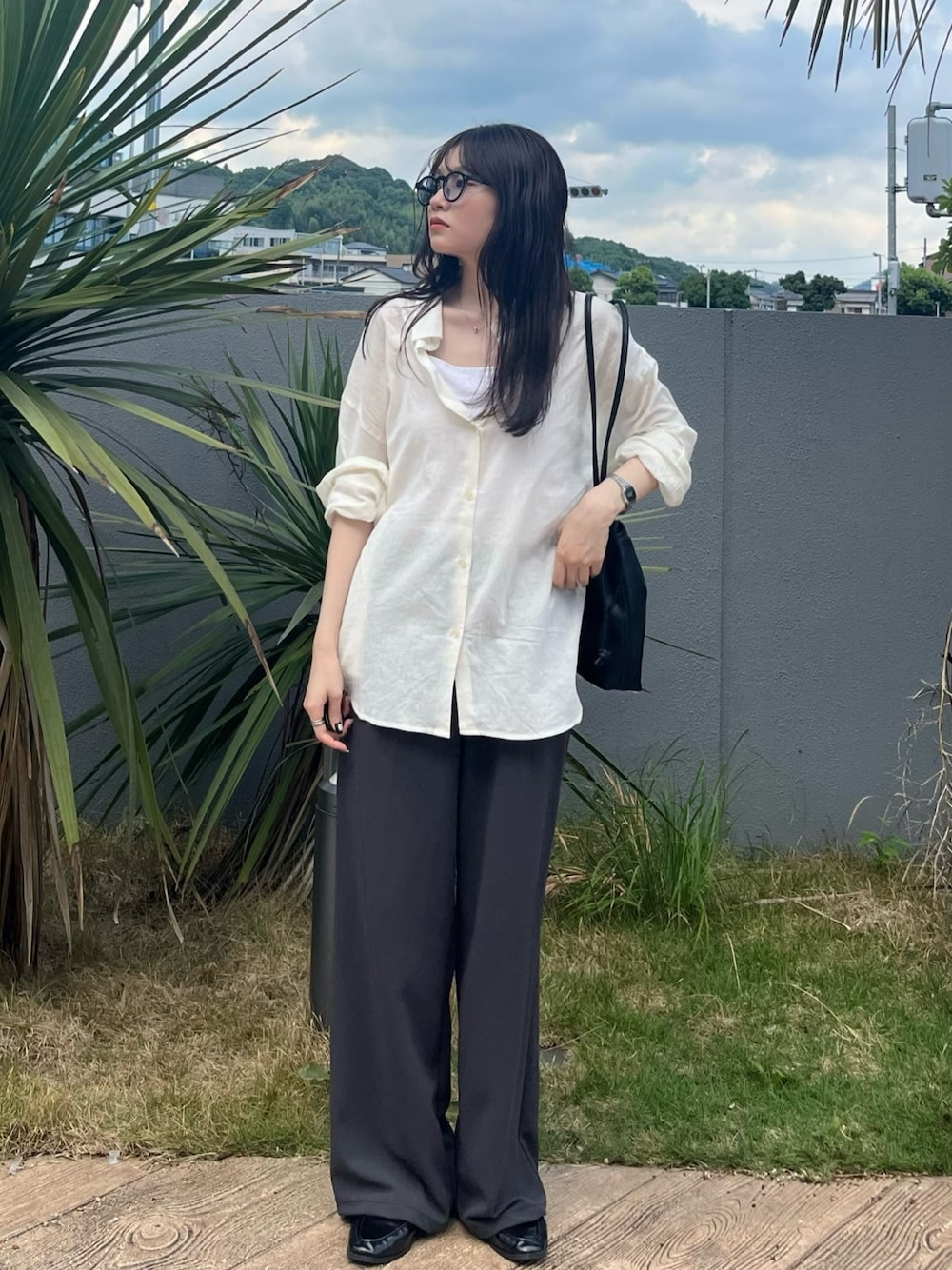 シアーシャツを使った モノトーンで大人っぽいコーデ🩶 インナーはカップ付きキャミで楽チン 涼しく今から着ていただけます! 室内が冷房で寒い時大活躍間違いなしです◎ インナー次第で秋まで着られるのは 嬉しいですね♪ アイウェアもcoenのアイテム 着用しております👓✨ クラウンパント型でお洒落に決まります!