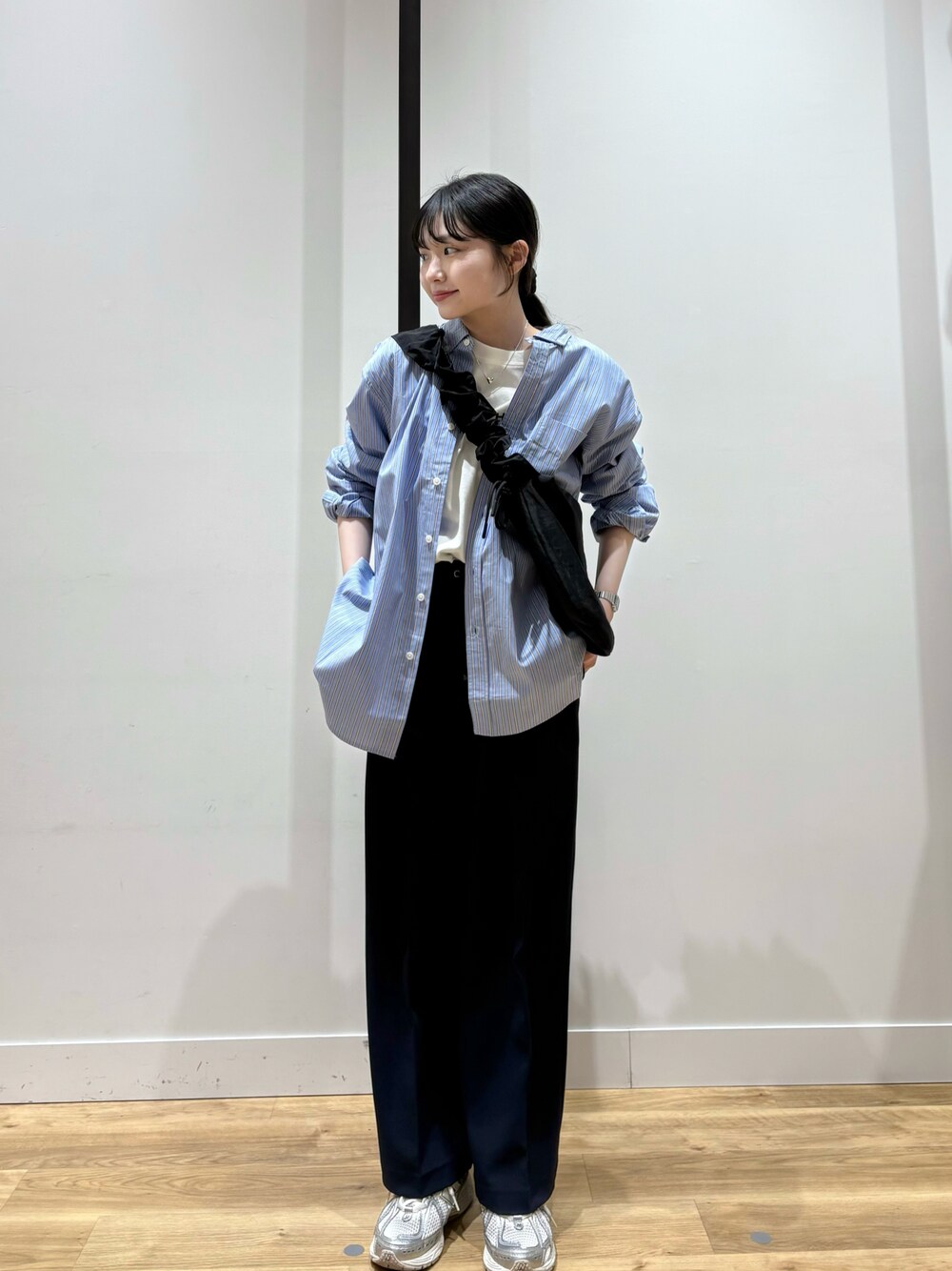 春に着たい爽やかな ストライプシャツコーデ🩵 【RONEL】のネイビーワイドパンツは ワイドパンツだけどスッキリと見える 絶妙なシルエットで、 ウエストはゴム仕様で履きやすいのに フロントはスッキリ見えで嬉しい◎ キレイめにも、カジュアルにも合わせられる 万能アイテムです✨ ストライプシャツは メンズのMサイズ着用です!