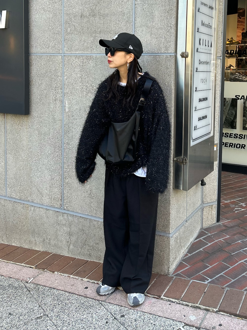 全身ブラックコーデ レイヤーどロンTを忍ばせて メリハリを。 バッグはボディバッグでメンズライクな印象に。