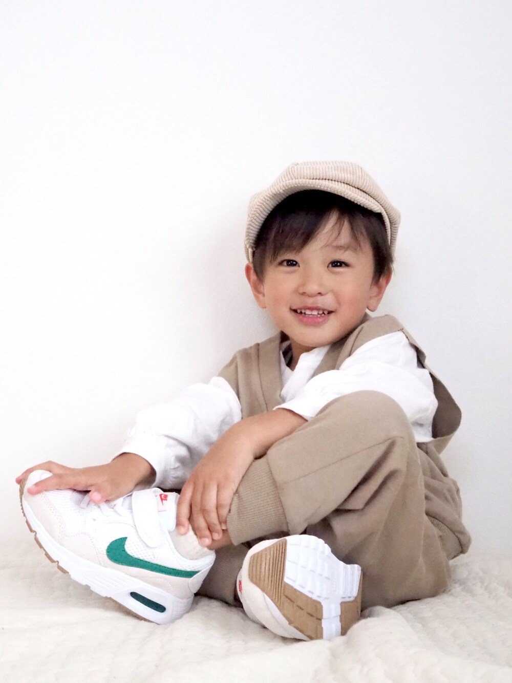 ホワイト系のスニーカーを着用したキッズの秋コーディネートの1枚目の写真