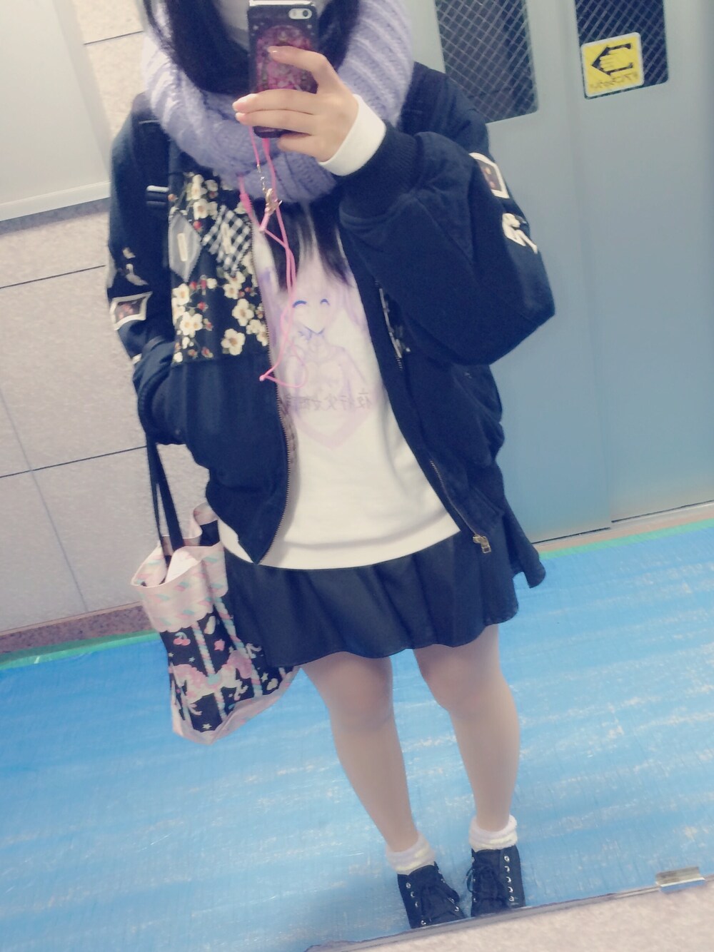 ブルゾン:PINK HOUSE スウェット:どげざちゃん(夜行少女概論) スカート:ノーブランド ママにめちゃかわなブルゾンをもらったので沢山着ようと思いますあったかいし。にしても太ったな〜