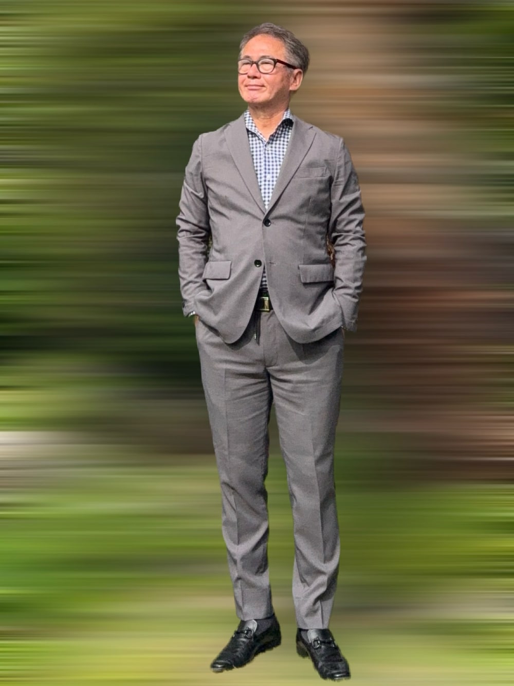 仕事着。クールビズでネクタイはしなくて良くなったけど、シャツはギンガムチェックのダブルカフス。カジュアルなダブルカフスのシャツは嬉しい。