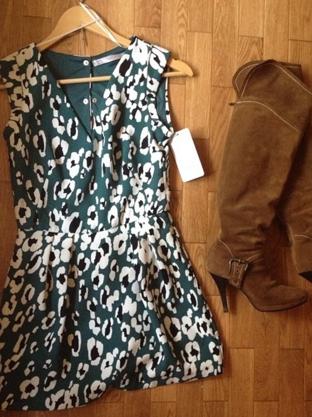 グリーン系のワンピースを着用したレディースの冬コーディネートの1枚目の写真