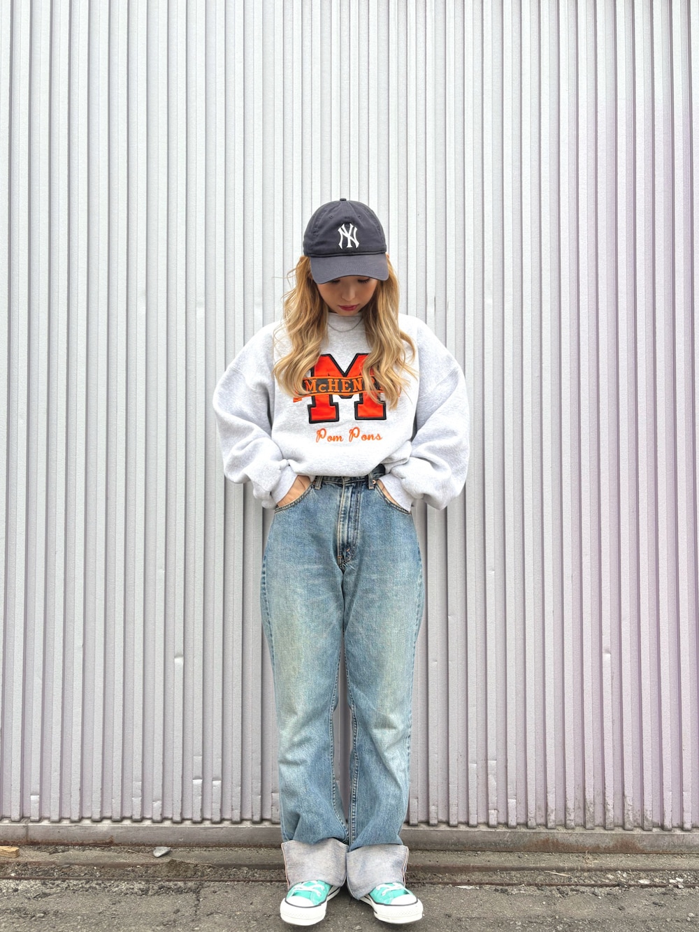 Hanesの肉厚スウェットに リーバイスデニムでカジュアルに👖🎶 差し色はスニーカーで👟💚