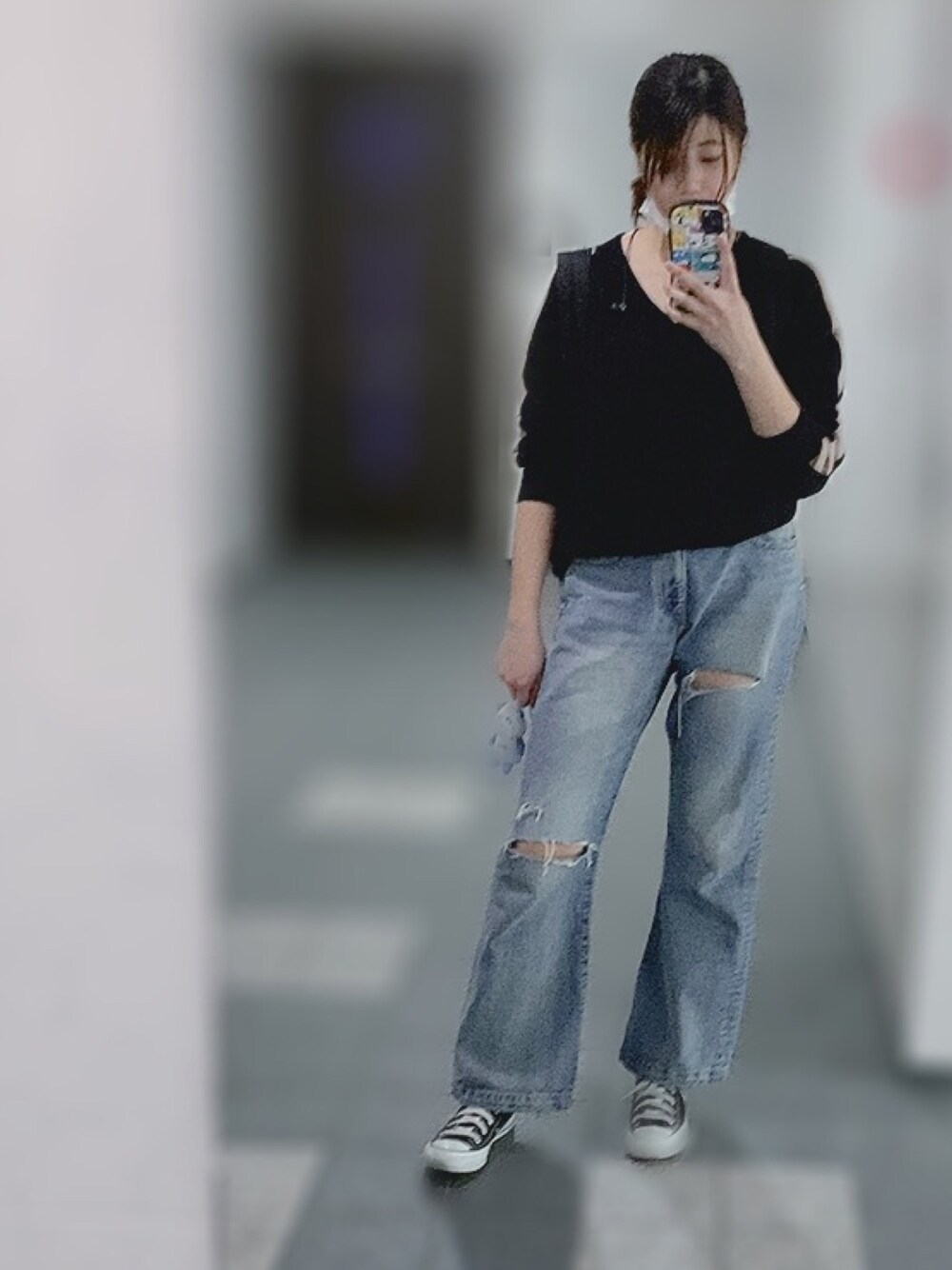 仕事終わりに。 薄めのニット1枚でも暑いぐらいやった笑 この時期服迷うよね、、、 明日はどんな服着ようかな〜 このデニム宇野ちゃんがコラボしたやつやけど、めっちゃいい! ダメージ具合もいいし、足が綺麗に見える😘