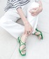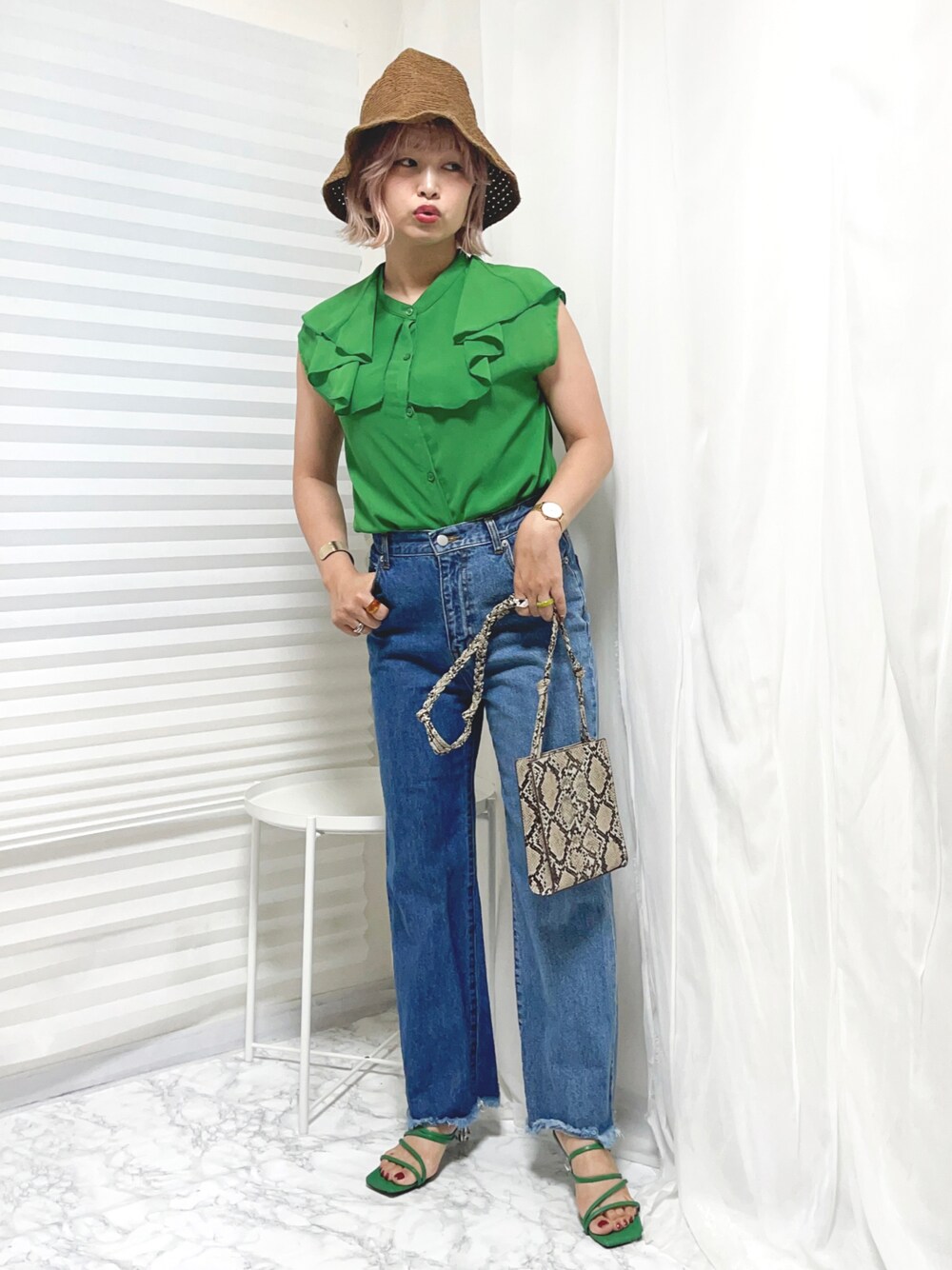 グリーンのフリル襟ブラウス着回し。 フリルが動きでて めちゃくちゃ可愛い! チューリップハットで カラフルハッピーに🦖⸒⸒
