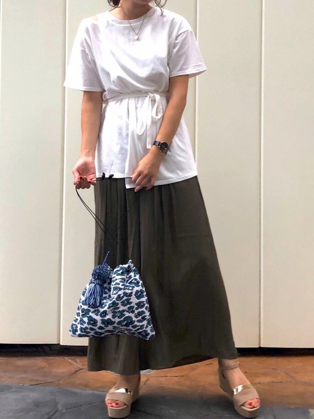 トレンドのショルダーデザイントップスはウエストマークの紐でスッキリ見えます。