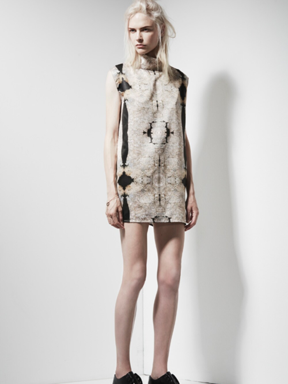 STONE AGE DRESS Mixed metal custom printed satin mini dress with funnel neck, large slit at back & side pockets http://shop.serpentandtheswan.com/collections/shop/products/stone-age-dress