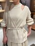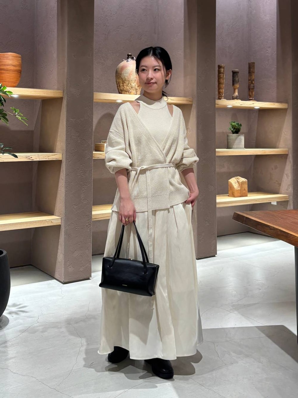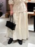 春らしいアイボリーカラーでまとめたスタイリング。 アンサンブルで着るロウシルクシリーズは程よい肌見せで抜け感を✨ シルク素材のニットはしっとりした肌触りで包まれ、とっても着心地の良いニット ドラマティックなシルエットのマリヨンスカート 太ももあたりからボリュームが出るシルエットで甘過ぎない大人なボリュームスカートです。☺️