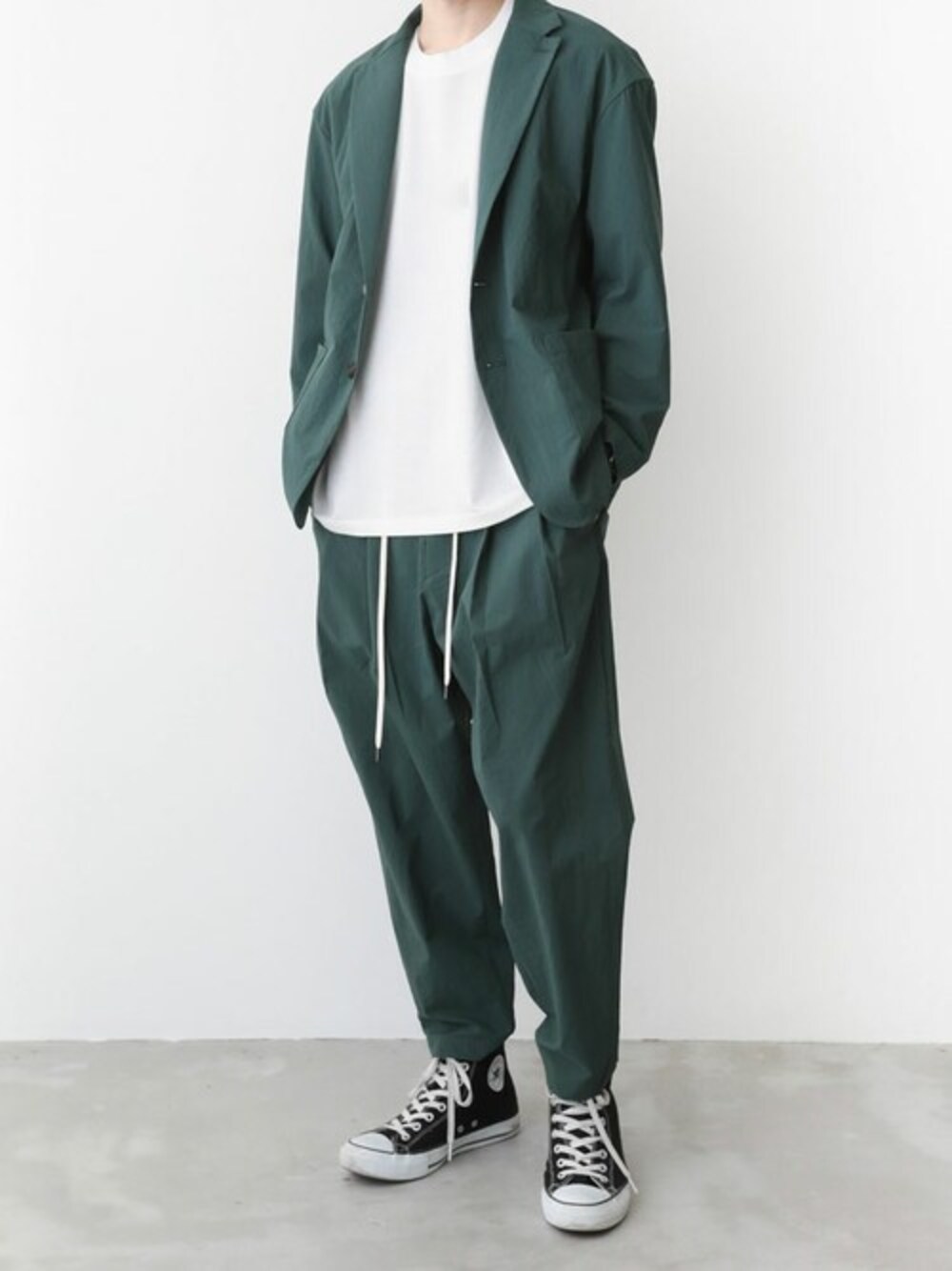 ストレッチナイロンの2Bジャケット。 リラックス感のあるサイジングでラフに着用できるのが魅力。 しわや汚れも付きにくくイージーケア出来るのもいいですね。 【FITTING】H173cm W54kg ジャケット / Size1 トップス / Size2 ワイドテーパードパンツ / Size1