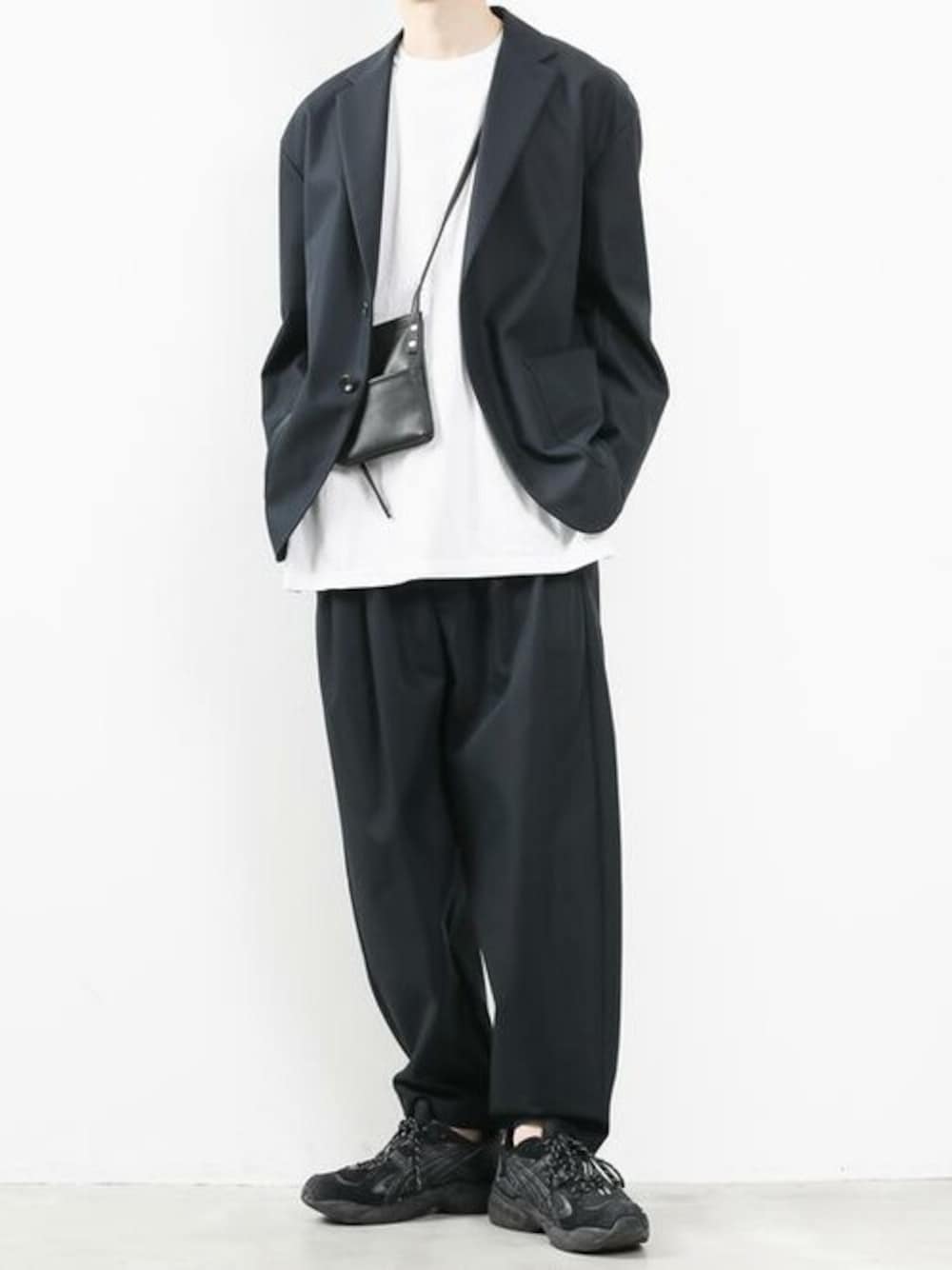 KAZUYUKI KUMAGAIの新作のセットアップを使ったスタイルです。 足元はスニーカーで春らしく軽快に。