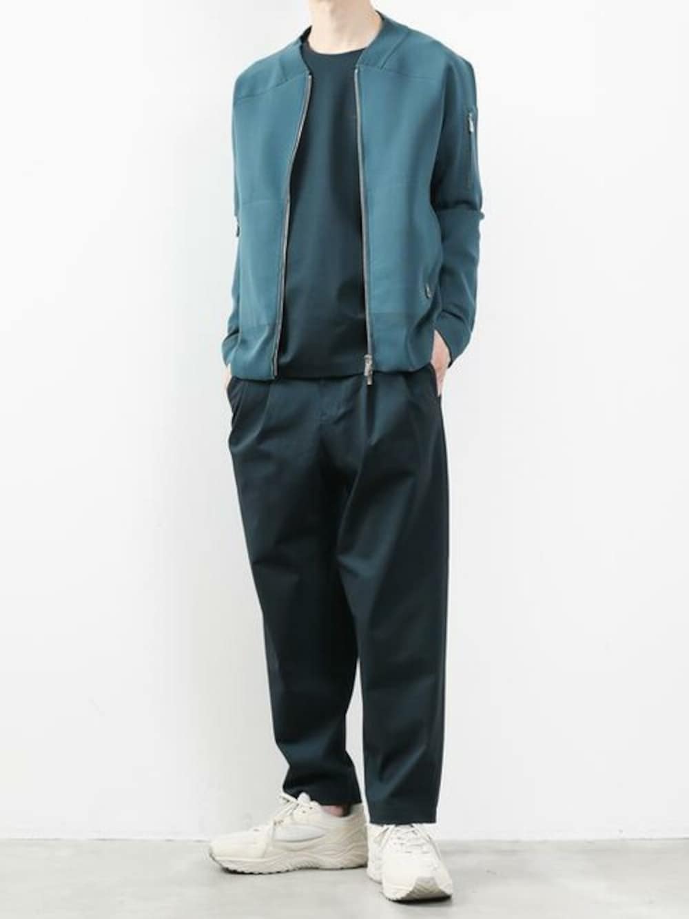 ニット素材の新型MA-1。 リラックス感のある着心地で柔らかな印象を与えてくれます。 艶のあるインナーとボトムをチョイスして大人感あるスタイルに仕上げました。