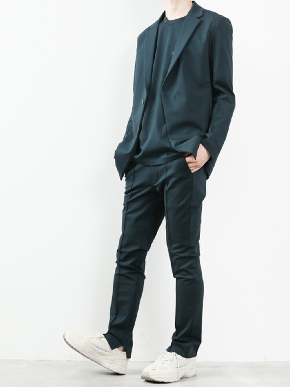 ミニマルなATTACHMENTの高機能ジャケット。 キレイ目素材のジャージを使っています。 伸縮性もあり快適な着心地です。 ボトムは同素材のスリムパンツで大人なセットアップスタイルに。