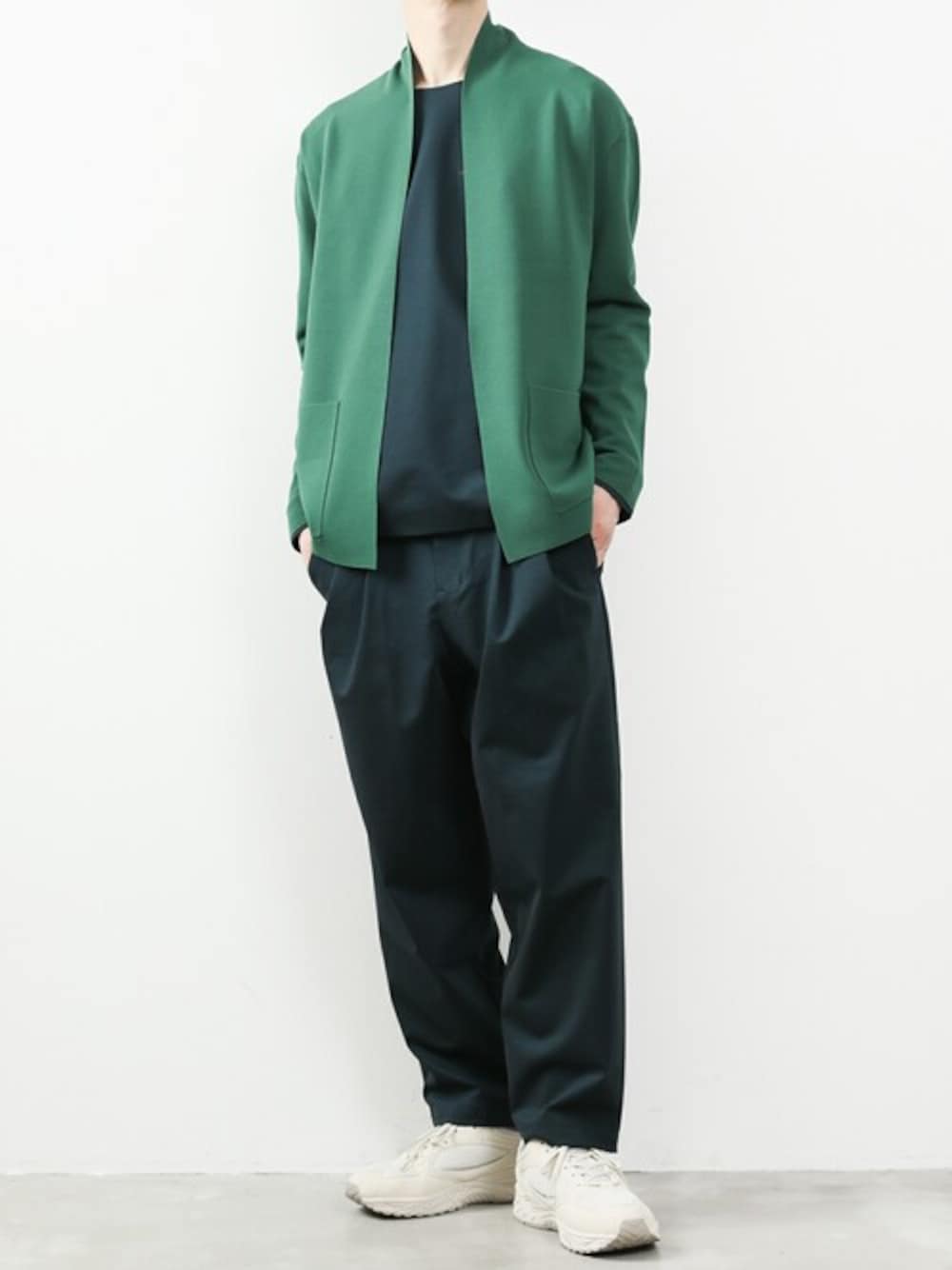 グリーンのカーディガンを使ったスタイリングです。 春らしい鮮やかな色味が良いですね。 ボトムはワイドパンツで合わせてラフに仕上げました。