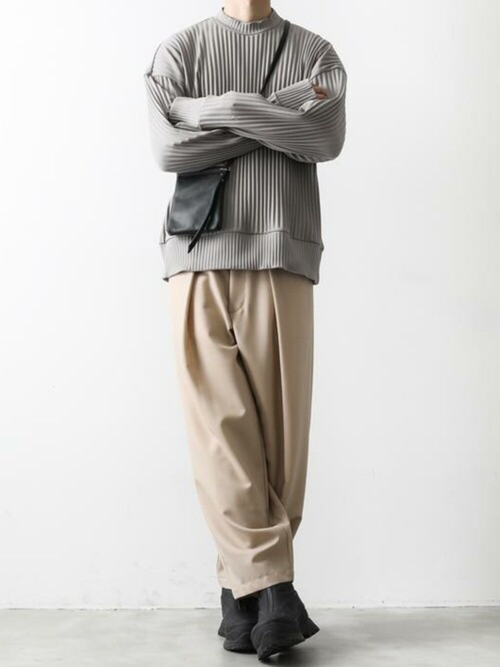 KAZUYUKI KUAMAGAIの新型ストレートパンツ。 フロントのタックの入りが特異な表情。 生地が外側に流れやや丸みを帯びたストレートシルエット。 グレー×ベージュの春らしいカラーコーデのスタイリングに仕上げました。