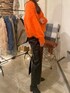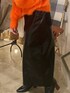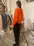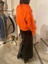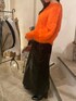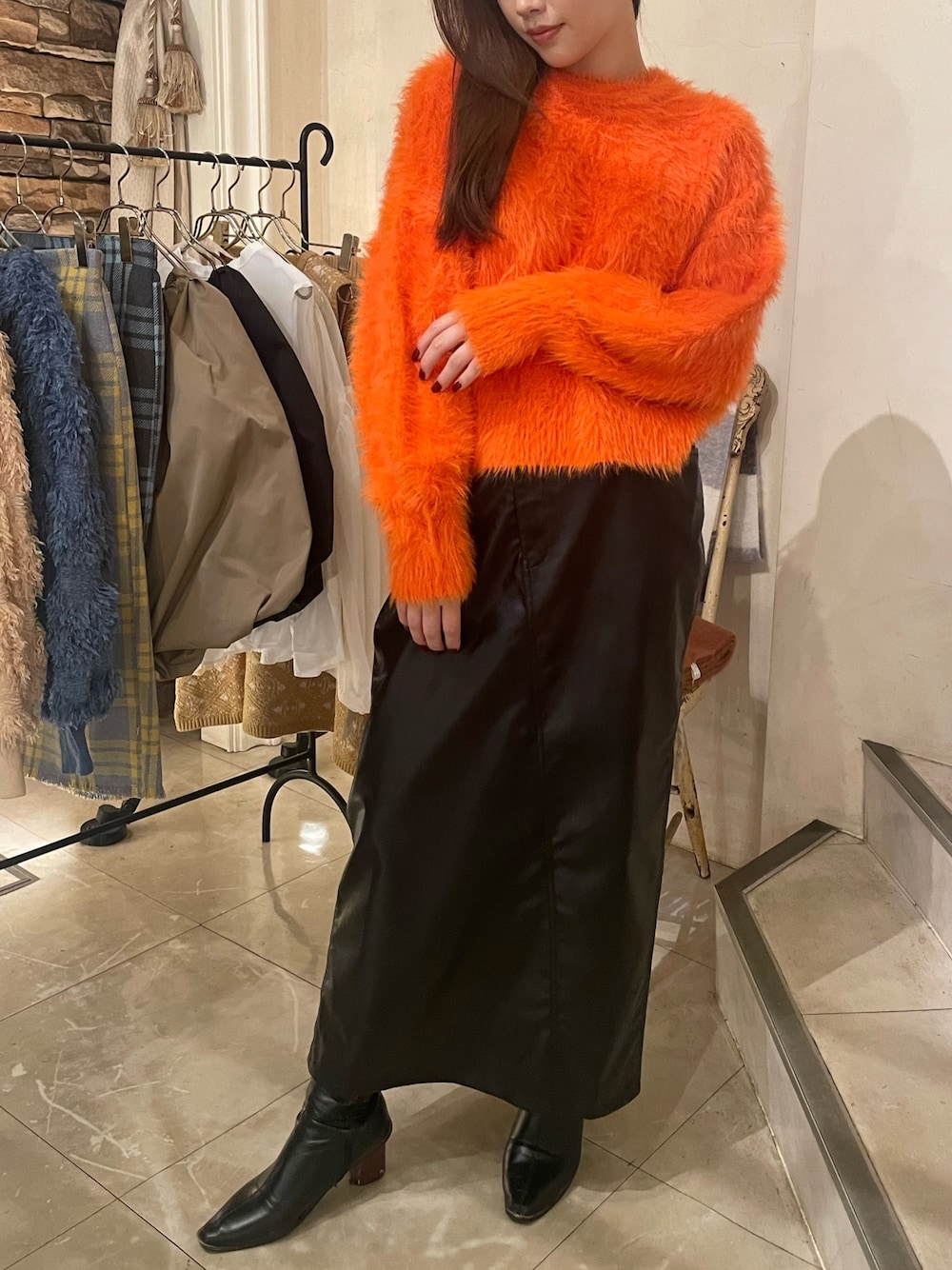 オレンジのニットが主役なコーデ組んでみた🧡 パキッとオレンジのもふもふが可愛過ぎるー! 黒のレザースカートも使いやすい!