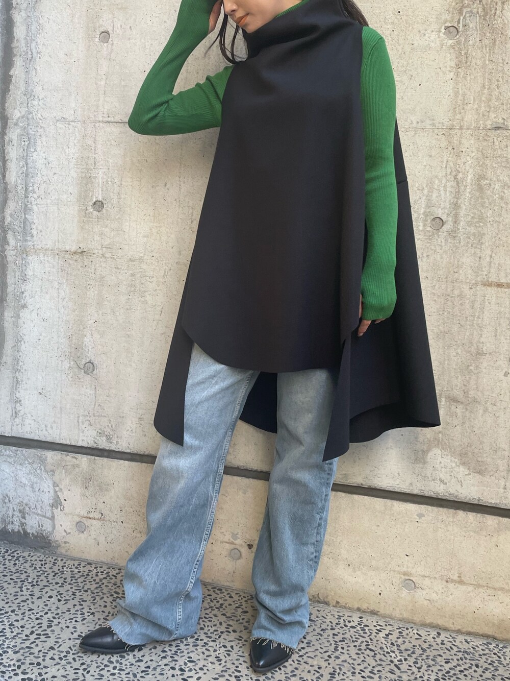 主役になれるブラックのジレ🖤 グリーンを差し入れの色にして ジーンズで決めすぎず モードカジュアルに!!!