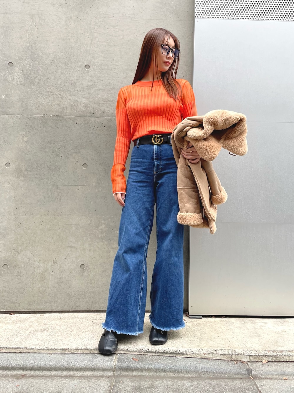 パキッとオレンジのトップスが 気持ちも晴れやかにしてくれる🍊 絶妙な透け感肌見せがオシャレ♡