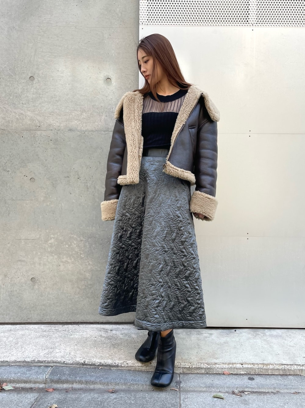 まだ冷える日は暖かいアウターを羽織って 中は透け感あるトップスがお気に入り💞 形が崩れないスカートも一日中ずっと綺麗