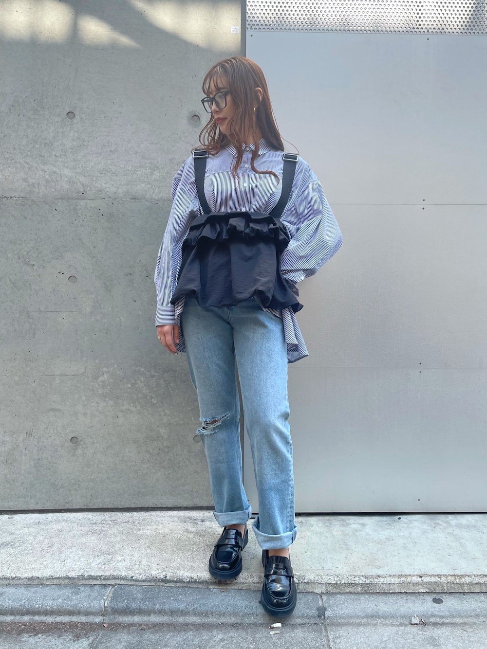 シャツの形が最高に可愛い🩷 ストライプに腰位置で黒のトップスを 合わせてみてかなり上級者コーデに 見えるけどとてもカジュアルなので 真似しやすい✌️